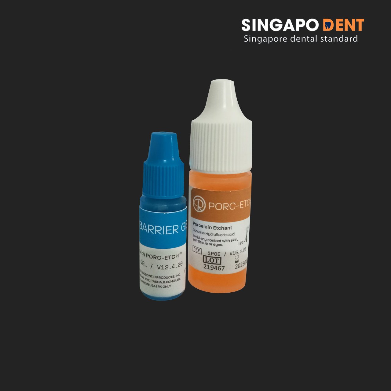 Caution: Porc-Etch™ contains 4% hydrofluoric acid. Use a rubber dam. Avoid contact with gums or soft tissues.