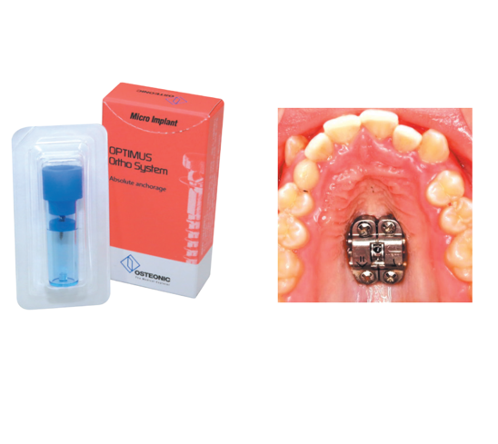 Rapid palatal expansion supported by miniscrews: 4 miniscrews are placed on the palate, and the expander rests on them; turning the central screw gradually widens the dental arch. Effective even in non-growing patients.